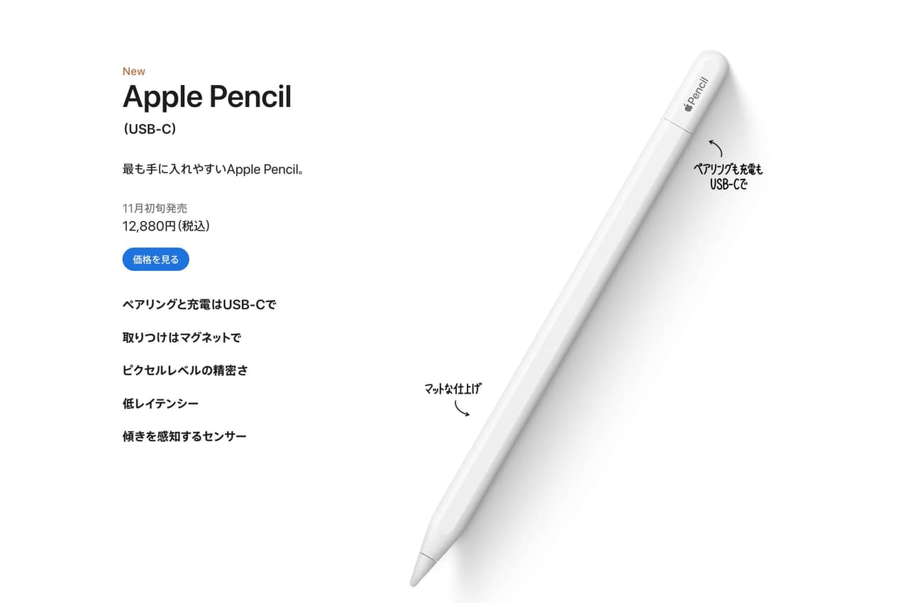 AppleはUSB-Cポートを搭載する新型の「Apple Pencil(USB-C)」を発表しました。日本では11月初旬発売とのこと。