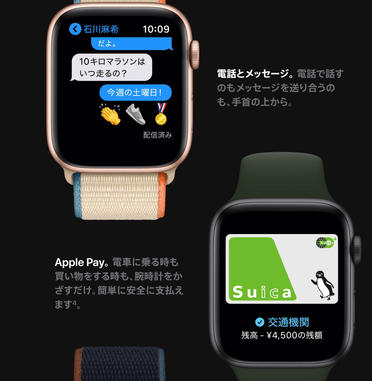 ▼Apple Watch 6はiPhoneに変わってメッセージと電話を行える便利さも魅力的!個人的にはこの機能がメチャクチャ便利そうで気になっております(*’ω’*)。さらにApple Payにももちろん対応しており、Apple Watch 6をかざしてSuica決済もお手の物(右腕に付ける必要はあるけど)。↓