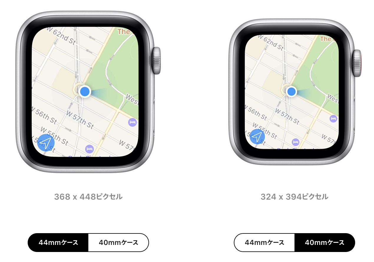 Apple Watch 6とSEは44mmと40mmの2サイズを選ぶことができてデザインも一緒。解像度も44mmが448×368、40mmが394×324で同一なので、ディスプレイの精細さも変わりません!