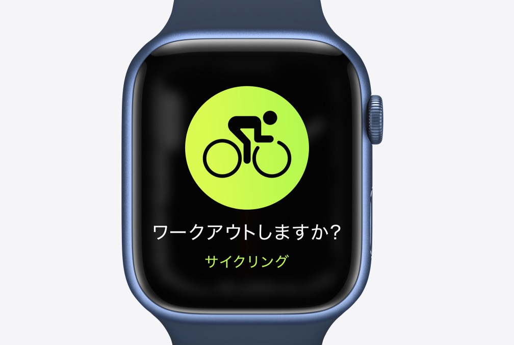 Apple Watch Series 7は自転車に乗っていることを自動的に検知してワークアウトをスタート。万が一、転倒した場合も転倒検出機能で緊急通報サービスに電話してくれる機能もある。