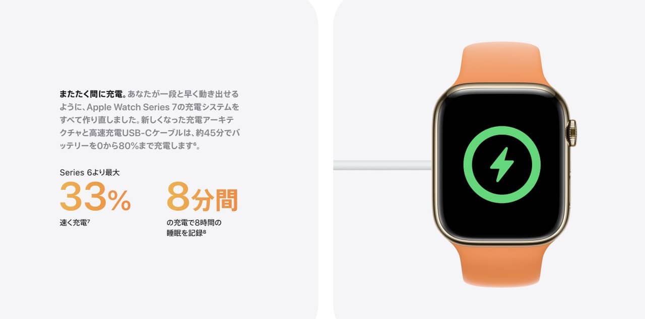 ▼充電速度もSeries 6比で33%も向上。45分でバッテリーを80%を充電できるから充電忘れてもなんとかなりそう。↓