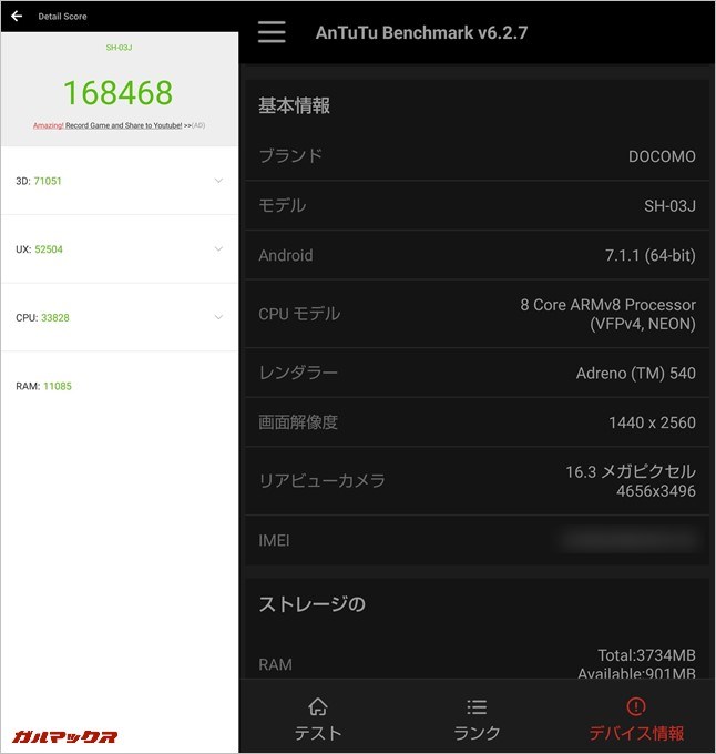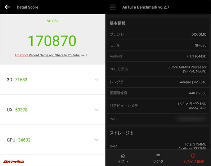 AQUOS R SH-03J(Android 7.1.1)三代目の実機AnTuTuベンチマークスコアは総合が161086点、3D性能が66206点。