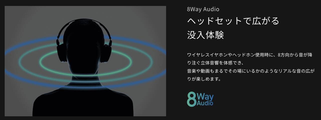 ▼そうそう、前モデルのProに搭載されていたイヤホンやヘッドホン使用時に8方向から音が降り注ぐ立体音響「8Way Audio」にも対応したそうです!↓