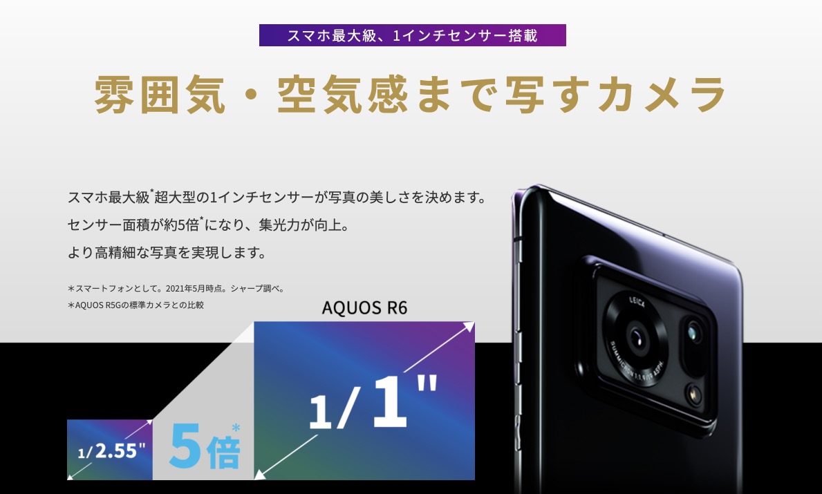 シャープが新スマホAQUOS R6を発表。最大の注目点は1インチセンサー搭載のカメラ。6月中旬以降にドコモやソフトバンクから発売予定とのことです!