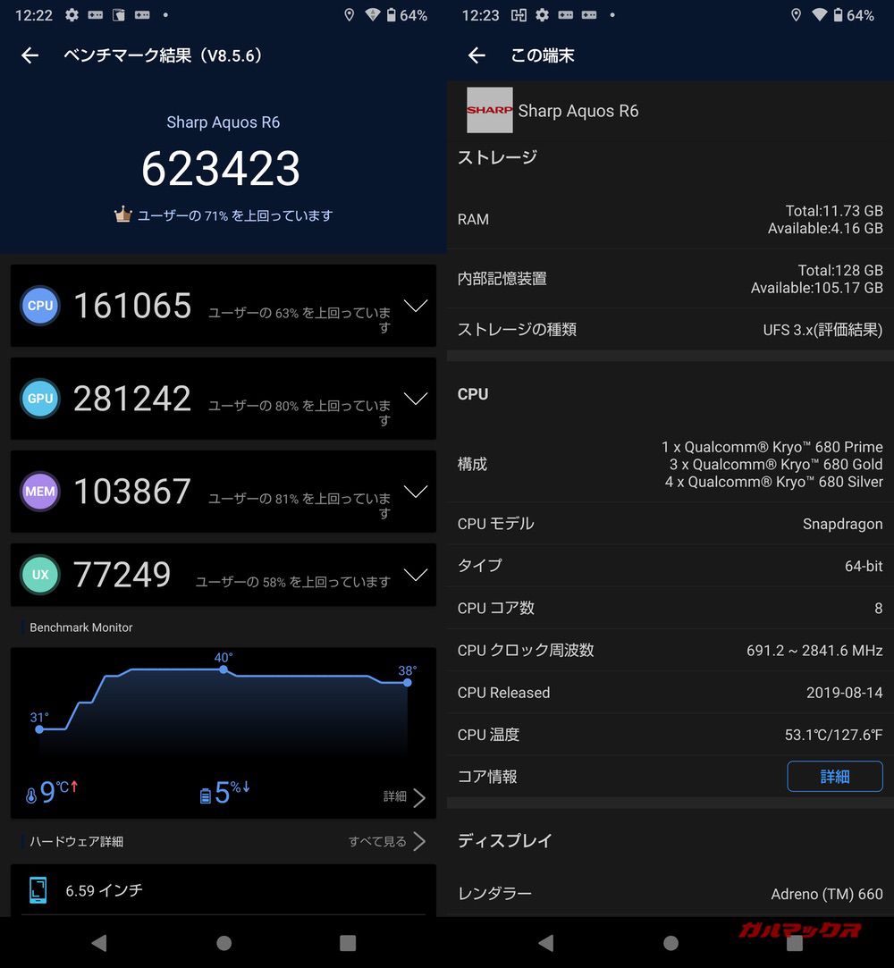 ▼AQUOS R6 SH-51Bの実機でAnTuTuを測定。Ver9は謎のエラーがでたから今回はVer8で測定してるんで注意。総合スコアは623423点、GPUスコアは281242点。↓