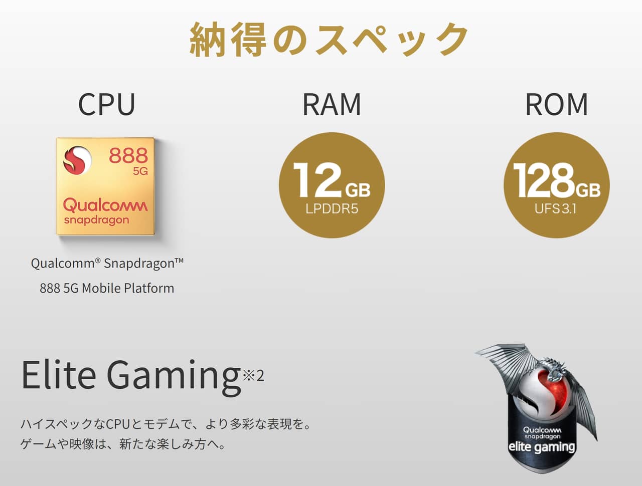 ▼SoCはSnapdragon 888に加えてメモリは12GBも搭載!メモリがかなり大きいため、負荷の大きいアプリを動かしてても、複数アプリを立ち上げた状態でも安定性が高いんす。保存容量は128GBに加えてMicroSDによる1TBまでの容量拡張にも対応しているのがGood!↓