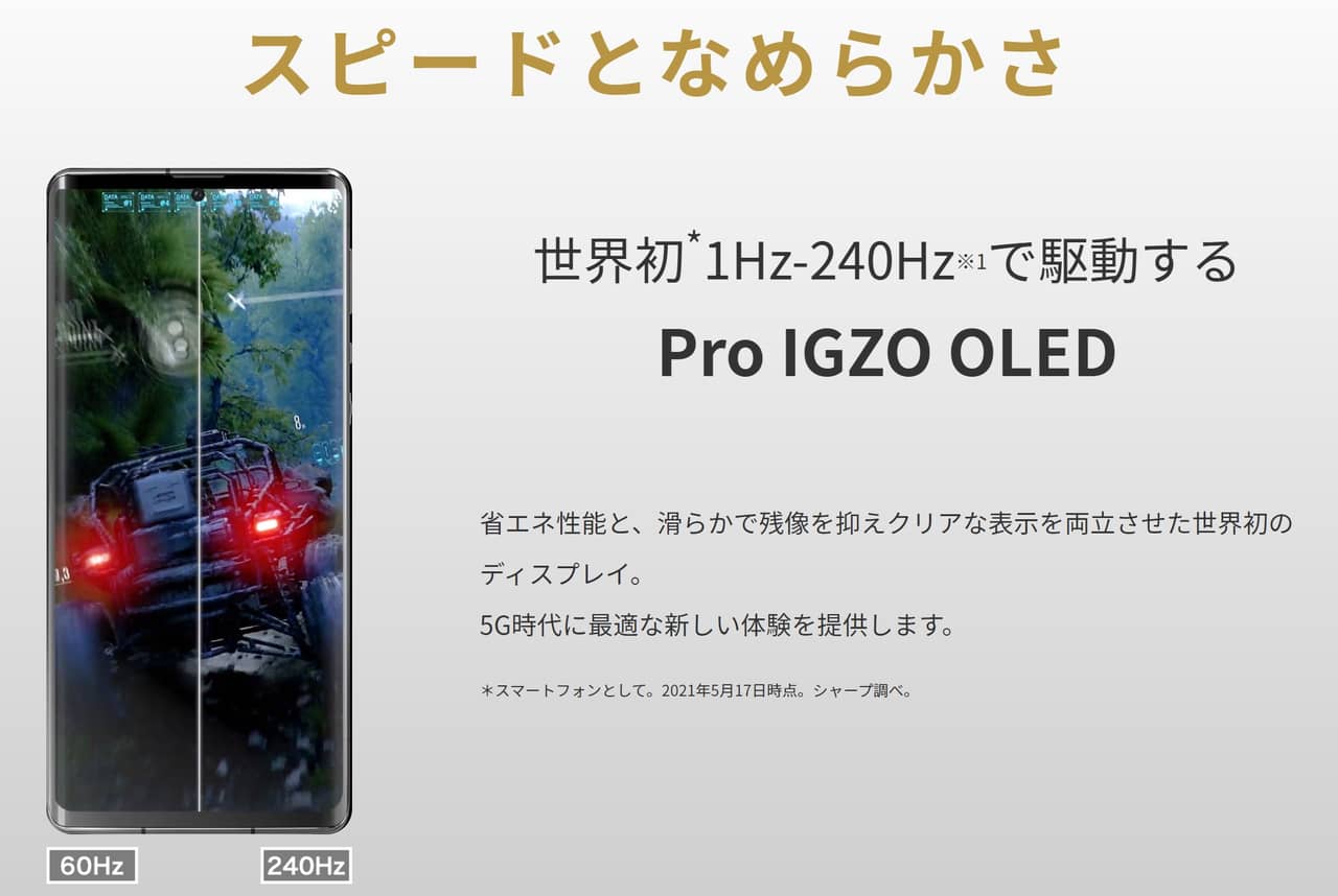 ▼ディスプレイはパンチホール&エッジ型で、有機ELのPro IGZO OLEDを採用!さらに擬似240Hz表示対応で、スクロールが超なめらかに動きます。指に吸い付いて離れないような動きで目に疲れにくいのが魅力!ハイエンドならではな部分です。↓