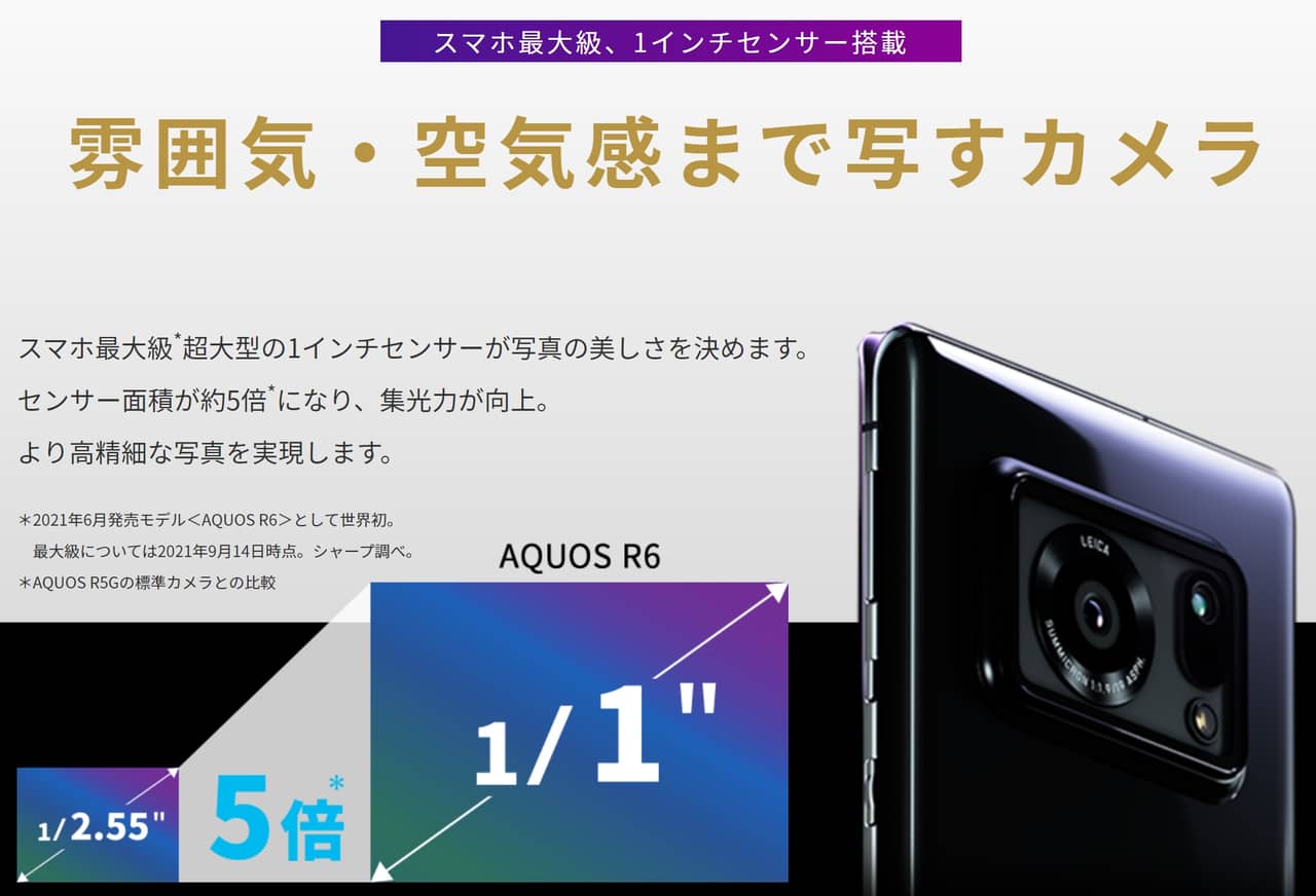 ▼このAQUOS R6 SH-M22はカメラを重視したハイエンドモデル!カメラは歴代スマホでもダントツに大きい1インチのセンサーサイズを採用しており、SHARP公式曰く「見たままの世界をその手に」というキャッチコピーを銘打ってます。↓