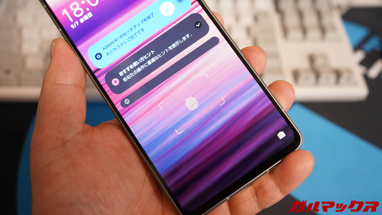 ▼AQUOS R7は画面に埋め込まれた指紋認証に対応。これ自体は特に珍しくもないんだが…なんか認証範囲広くないっすか?↓