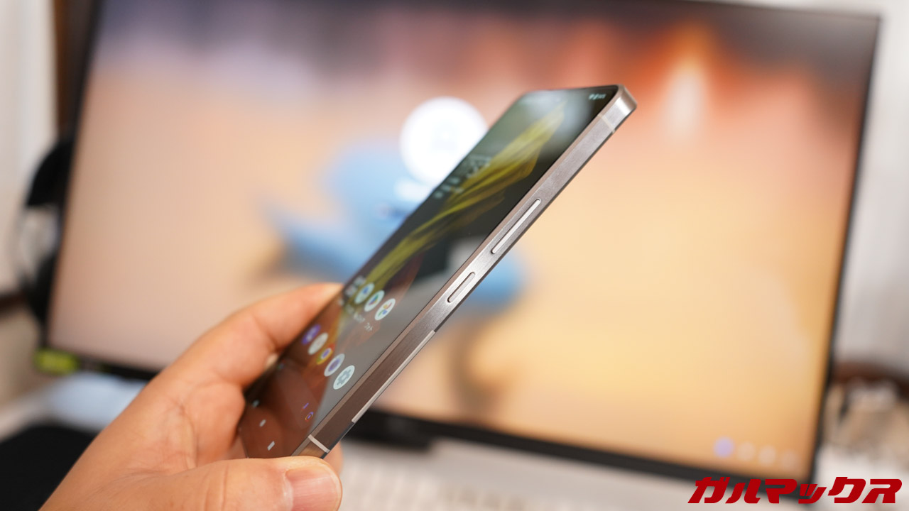 AQUOS R7の質感は高級モデルのそれ。ウン十万円するオーディオ機器みたいに「俺、高級モデルっすから」とサラリと言ってしまうような、そんな自信あふれる佇まい。これが約20万円のスマホか…正直、持つ手が震えてる。