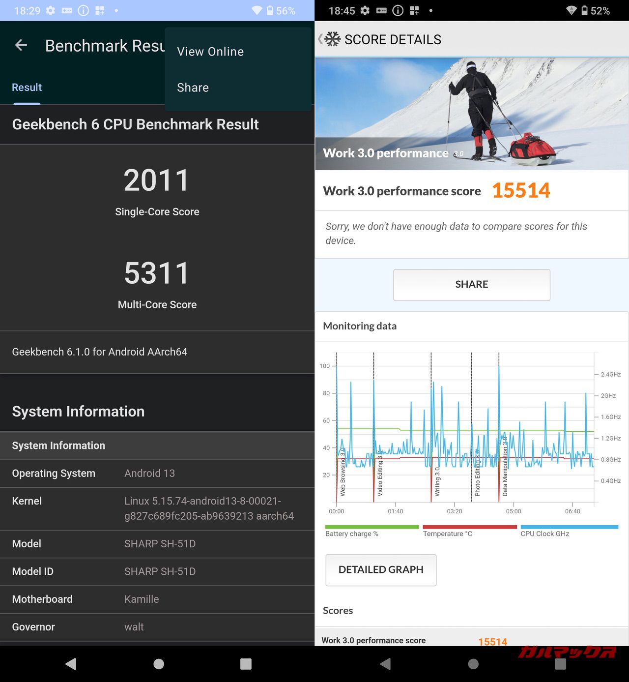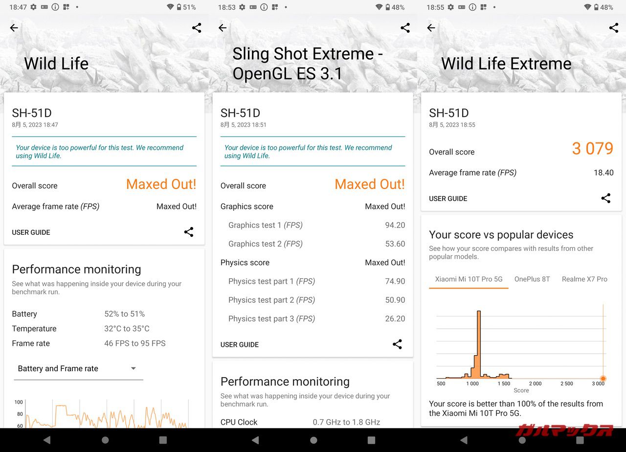 Snapdragon 8 Gen 2を搭載するモデルでは同様の検証で60FPSをキープしていますが、AQUOS R8 proはなぜか高負荷時にフレームレートがガクッと下がり46FPSとなっていました。つまり、踏ん張りが効きません。