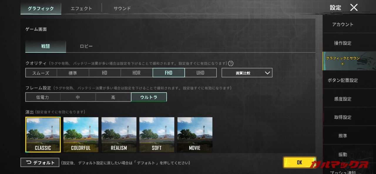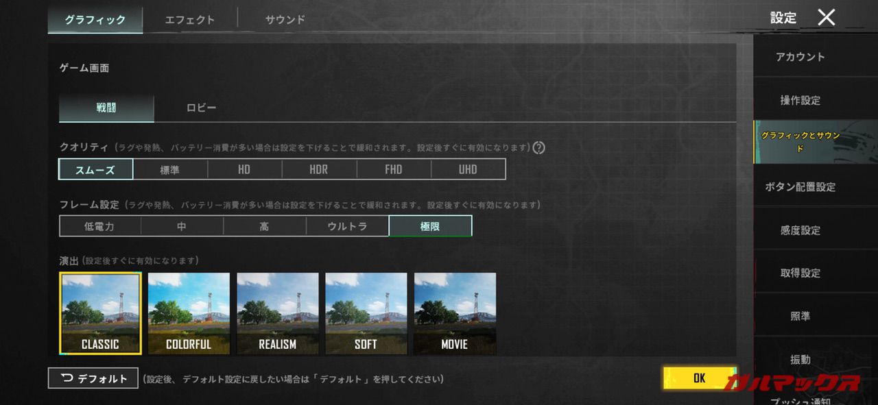▼PUBGモバイルではフレームレート重視だとスムーズ+極限(上限60FPS)、画質重視だとFHD+ウルトラ(上限40FPS)で設定可能です。↓