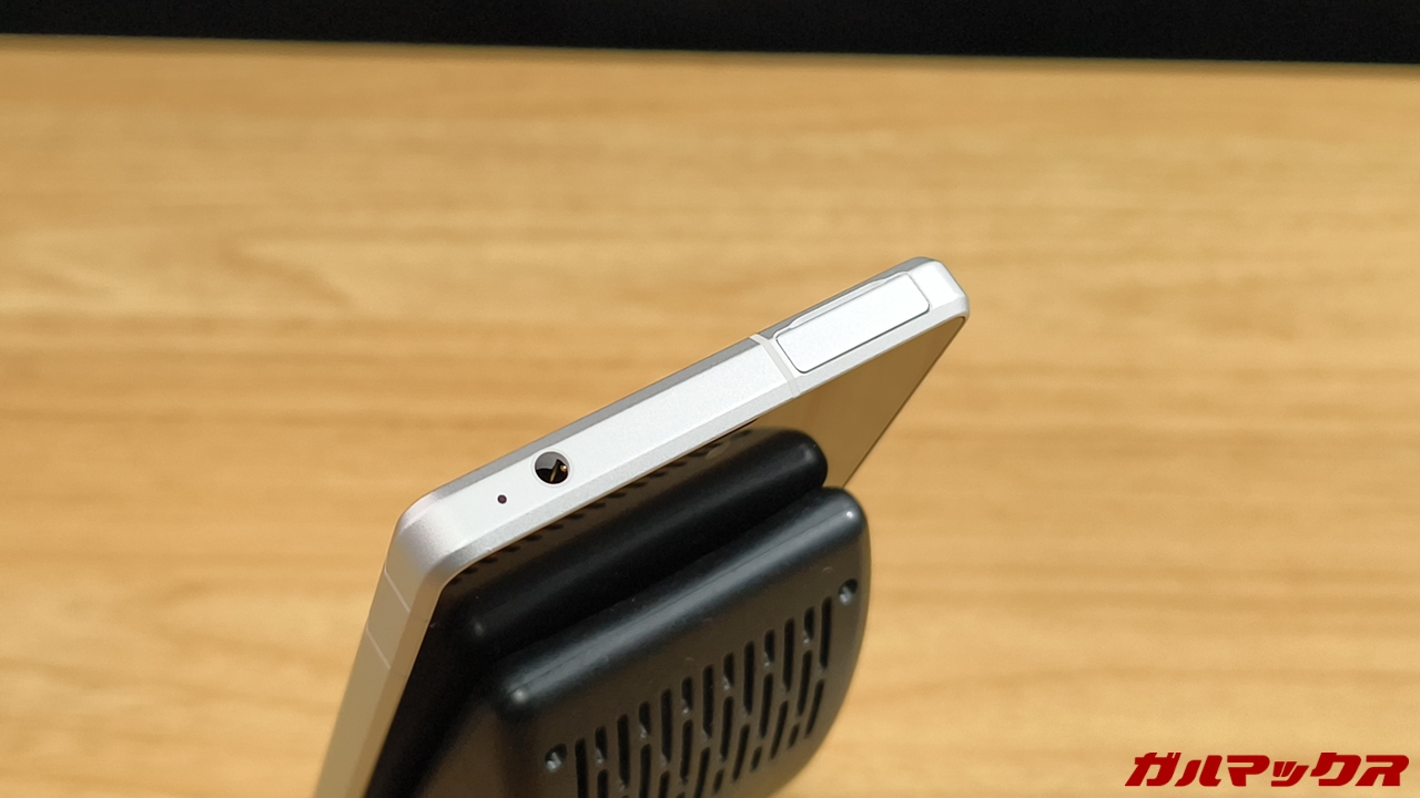 ▼上部にはSIMスロットとイヤホンジャック!どちらも国産スマホらしい要素を感じられます。SIMスロットはツメで出せるからSIMピン不要でかなりありがたい。↓