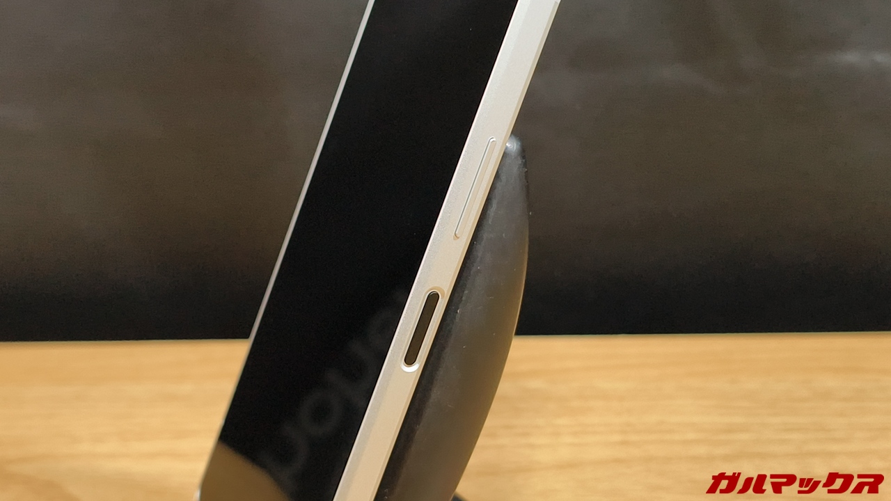 ▼右側には電源ボタンと音量ボタン。電源ボタンは黒色に塗り分けされており見やすいほか、総じて位置も低く押しやすいです。指紋センサーも内蔵。↓