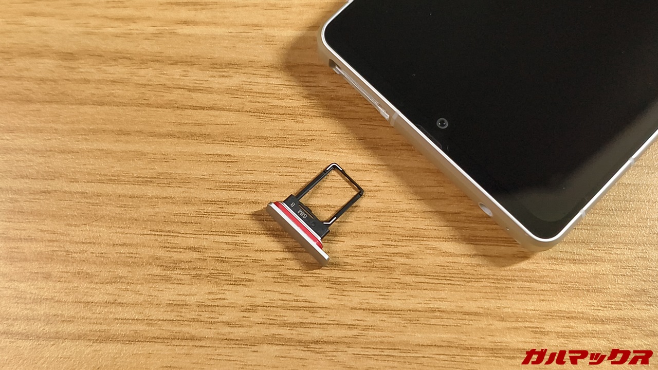 ▼SIMスロットはシングルタイプ。小型部品ながらしっかりとした作りでぐらつきと不安を感じさせない。日本ブランドならではに感じられるポイント。↓