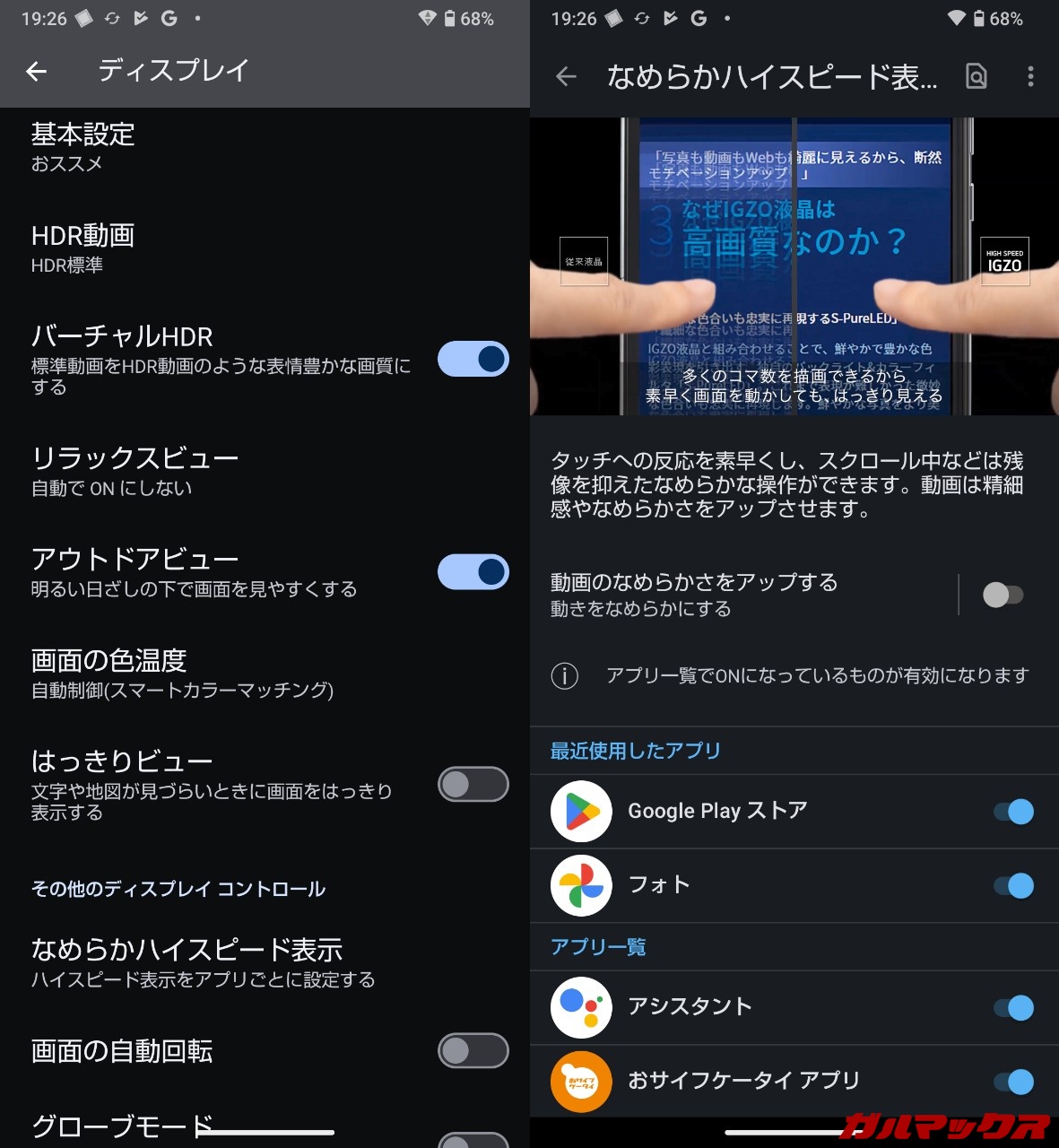 SHARPといえばIGZOという他メーカーにはない特殊な設計のディスプレイが特徴的。過去モデルからもIGZO液晶モデルを搭載するスマホは多くありますが、本機は液晶ではなく有機EL。つまり有機ELの強みであったAoDにも対応しますし、ダークモードでの省電力性もあるというのが魅力。