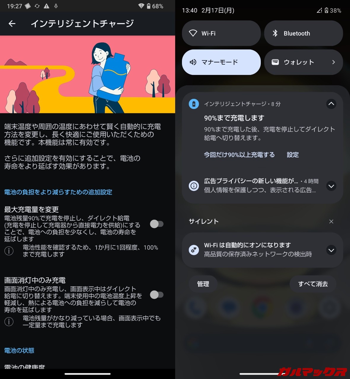 ▼電池持ちは並レベルなんですが、電池寿命を長持ちさせやすい機能のインテリジェントチャージに対応!満充電しっぱなしによるバッテリー劣化を大幅に押さえてくれる機能。さらに画面を消しているときだけ充電するといった柔軟な充電も出来ました。↓