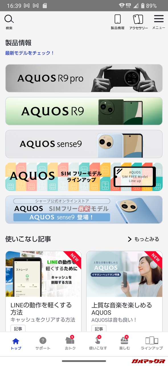 ▼プリインされているMy AQUOSというアプリからは端末のアクセサリ販売から使い方、コミュニティ的なものから着信音・通知音のダウンロードも可能。↓