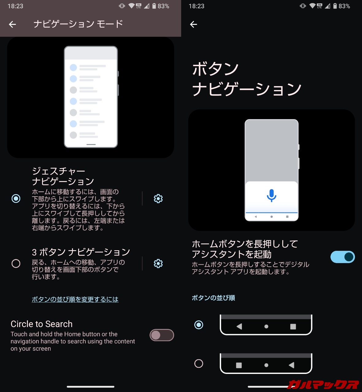 ▼ジェスチャー操作はもちろん、3ボタンのナビゲーションではボタンの並び替えに対応していました。通常は戻るボタンが左側固定で入れ替えできないんですが、本機はその入れ替えに対応。右側に据えるタイプの筆者にとってはありがたい。↓