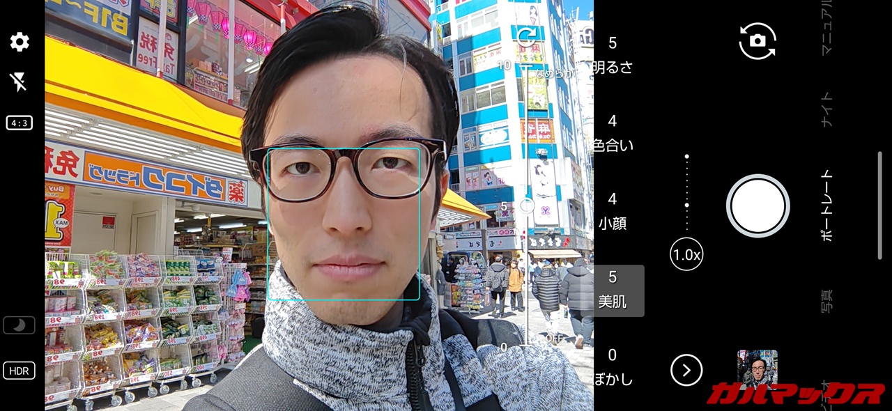 ▼インカメラは背景ボケのポートレート撮影やビューティー補正も対応していました。僅かですが文字がプレビュー画面とかぶってて不格好なUIデザインなのが惜しいところではある‥↓