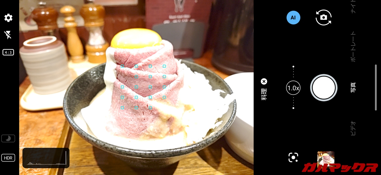 シャッター音は鳴りますが、「カチ‥」といった音でかなり控えめ。周りを驚かせずに、メシとか、メシとか、メシとか‥いろんなメシを撮影できるのも筆者の気に入ったポイントの1つです。