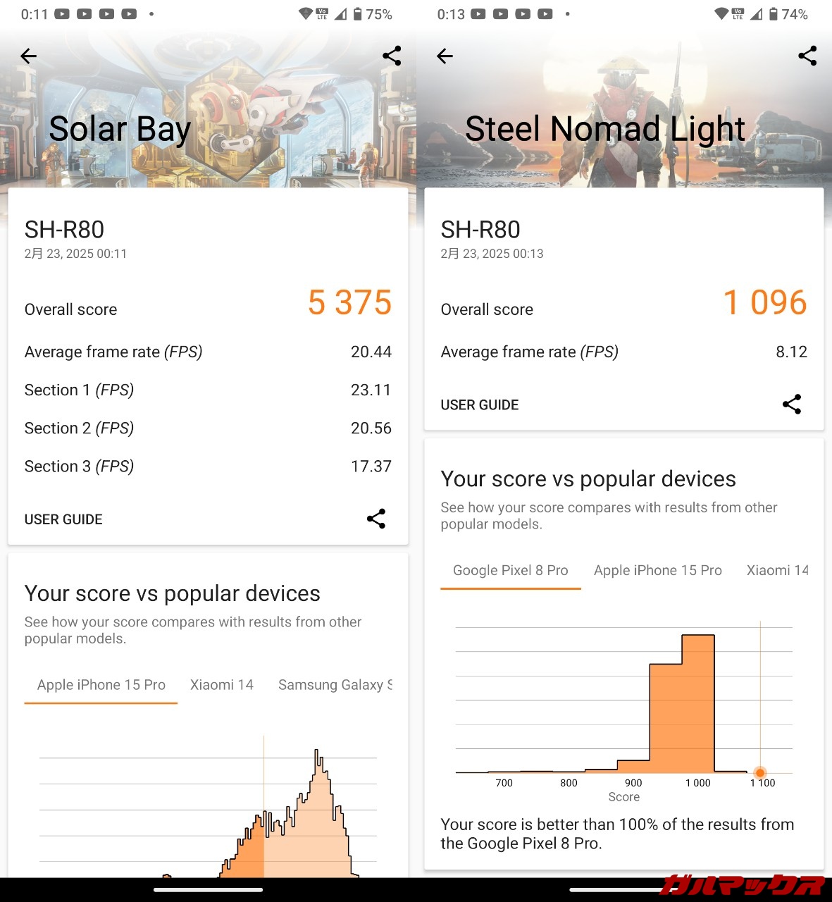 現時点ではSnapdragon 8 Gen 3やSnapdragon 8 Eliteが出ており2世代前といえるチップセットながら、この8 Gen 2搭載モデルのAQUOS R8も非常に快適。Dimensity 9400(8 Elite相当)を搭載するvivo X200 Proのそれとほぼ遜色ないレベル。