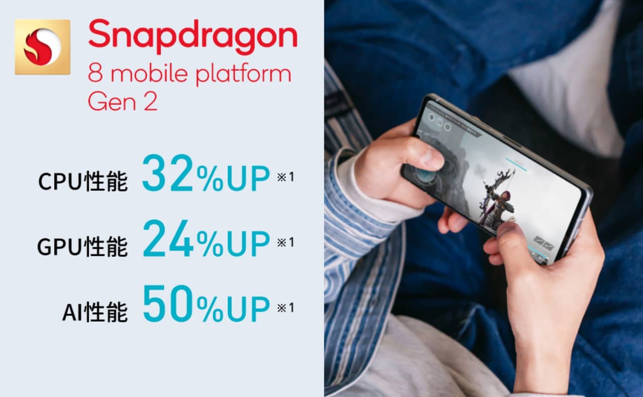 ▼SoCはハイエンドチップであるSnapdragon 8 Gen 2をドドンと採用!ベースグレードながらも最高峰の性能を持つチップを突っ込むとかいい意味で頭おかしいゾ。↓
