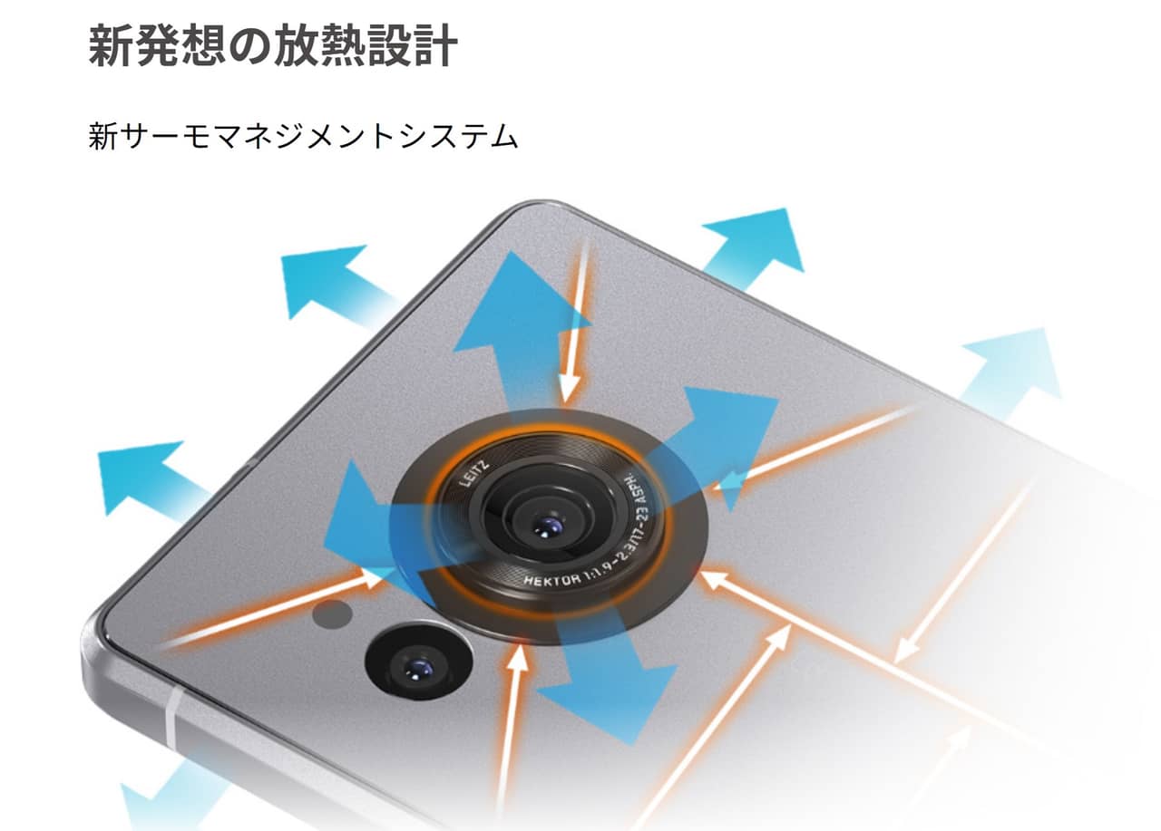 ▼面白いのが排熱システム。冷却機構のあるスマホって内部に放熱板や液冷とか搭載するんだけど、AQUOS R8はカメラから外部に熱を放出するというニュータイプ。↓