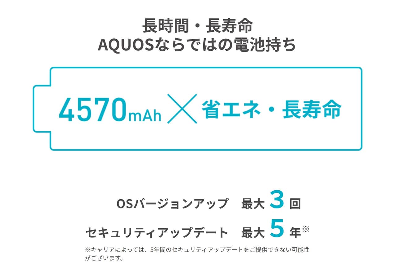▼バッテリー容量は4,570mAh。ここはちょっと物足りなさを感じますね。OSバージョンアップとセキュリティーアップデートが長いのは嬉しい!↓
