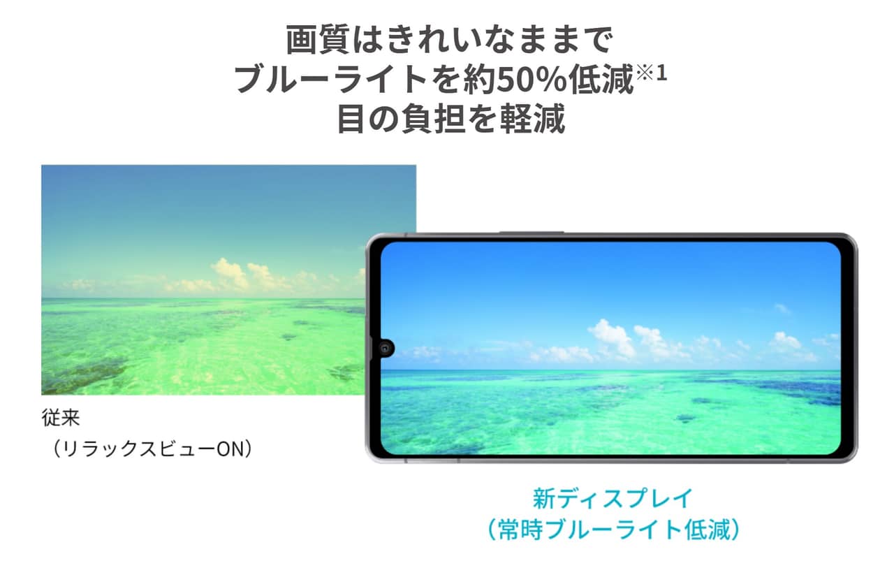 ▼もう1つの特色が常時ブルーライト低減に対応したこと。通常のブルーライト低減だと画面が黄色っぽくなって見栄えがメチャクチャ変わっちまうんだけど、AQUOS R8は画質をきれいに維持しつつブルーライトを抑えてくれるんだそう!↓