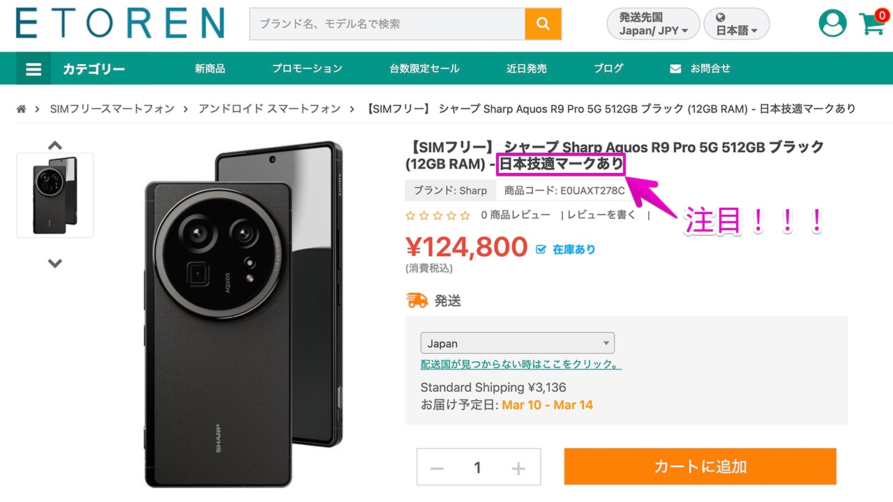 本記事で紹介しているETORENで購入可能な海外版AQUOS R9 proは、バッチリ技適付き。それはトップ画像の製品名を見てもらえば分かるはず!「日本技適マークあり」と記載されてます。