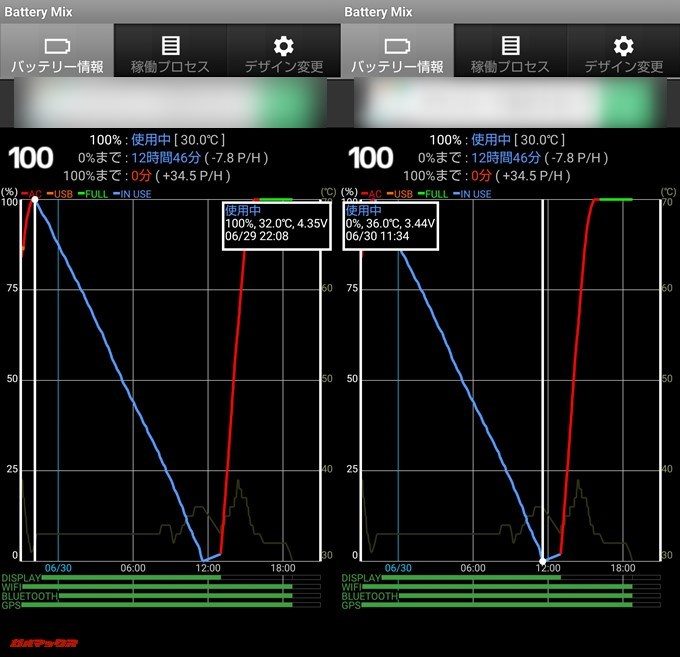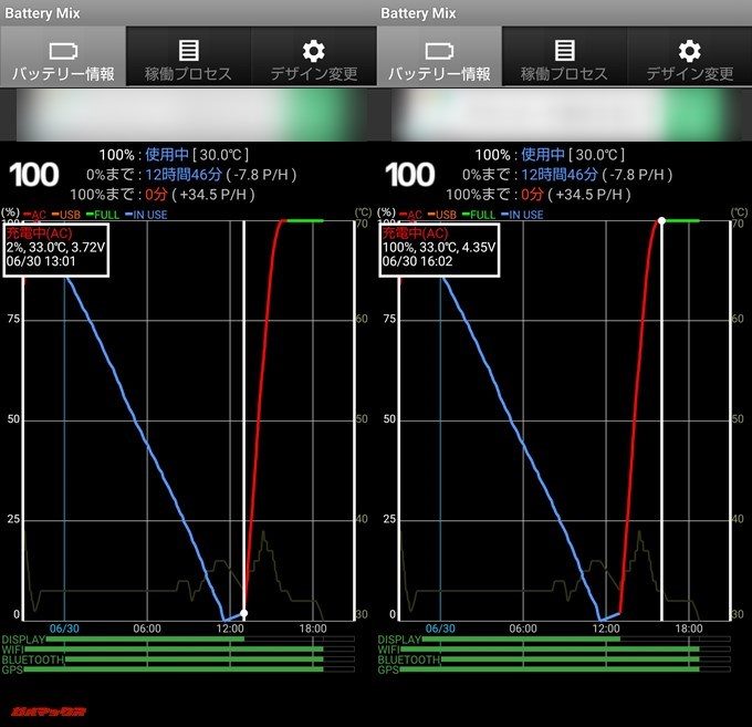 バッテリー残量を計測してグラフ化するアプリを利用しているので、バッテリー切れ直前にアプリが終了する場合があり数%の誤差が出る場合があるのでご了承下さい。