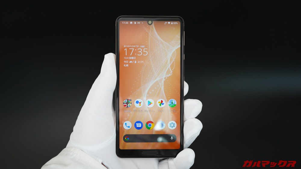 AQUOS sense4は5.8型ディスプレイを搭載。横幅は71mmと比較的コンパクトなサイズ感で手当たりもよく取り回しが良い。