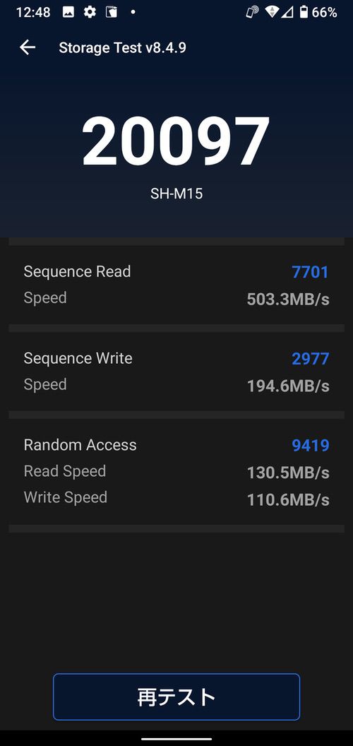 ▼ストレージ速度は読込が503.3MB/s、書込みが194.6MB/sでこちらも値段なりといったところ。↓