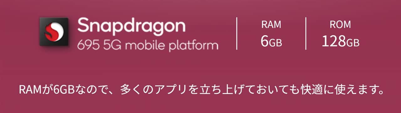▼SoCはミドルレンジでも高い性能を持つSnapdragon 695を採用しておりメモリ(RAM)は6GB、保存容量(ROM)は128GB。普段使いやカンタンなゲーム程度だったら不満はまず感じないでしょう(`・ω・´)。↓