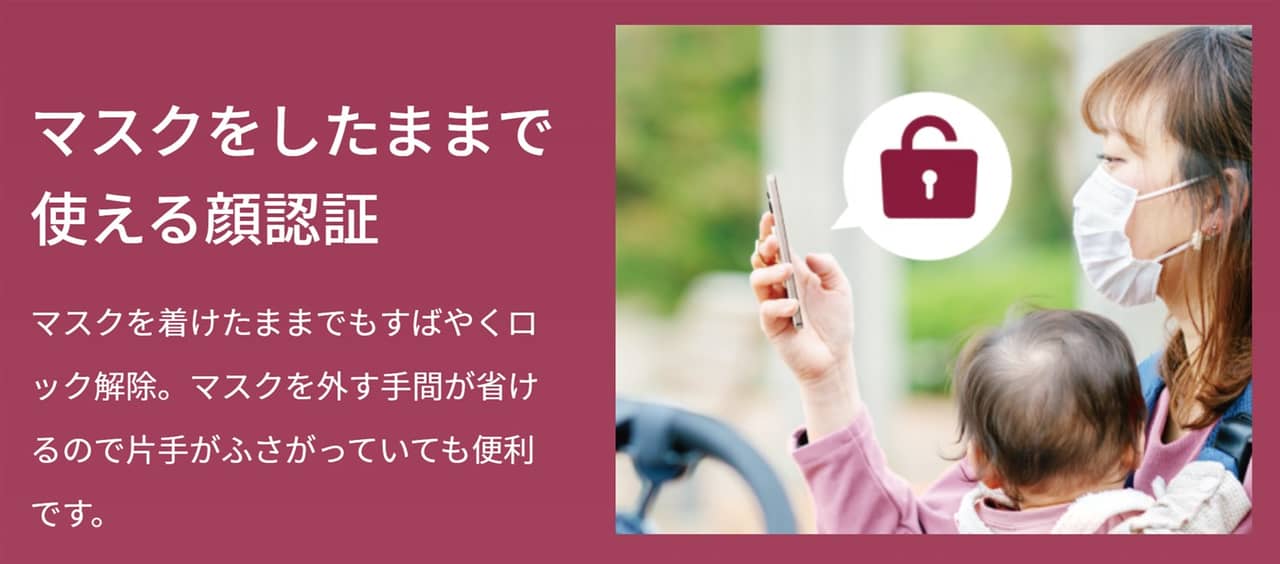▼顔認証に対応しているのはもちろん、マスクをしたままでも認証できるんだそうです!未だマスクが欠かせない状況でも認証できるのは嬉しい。↓