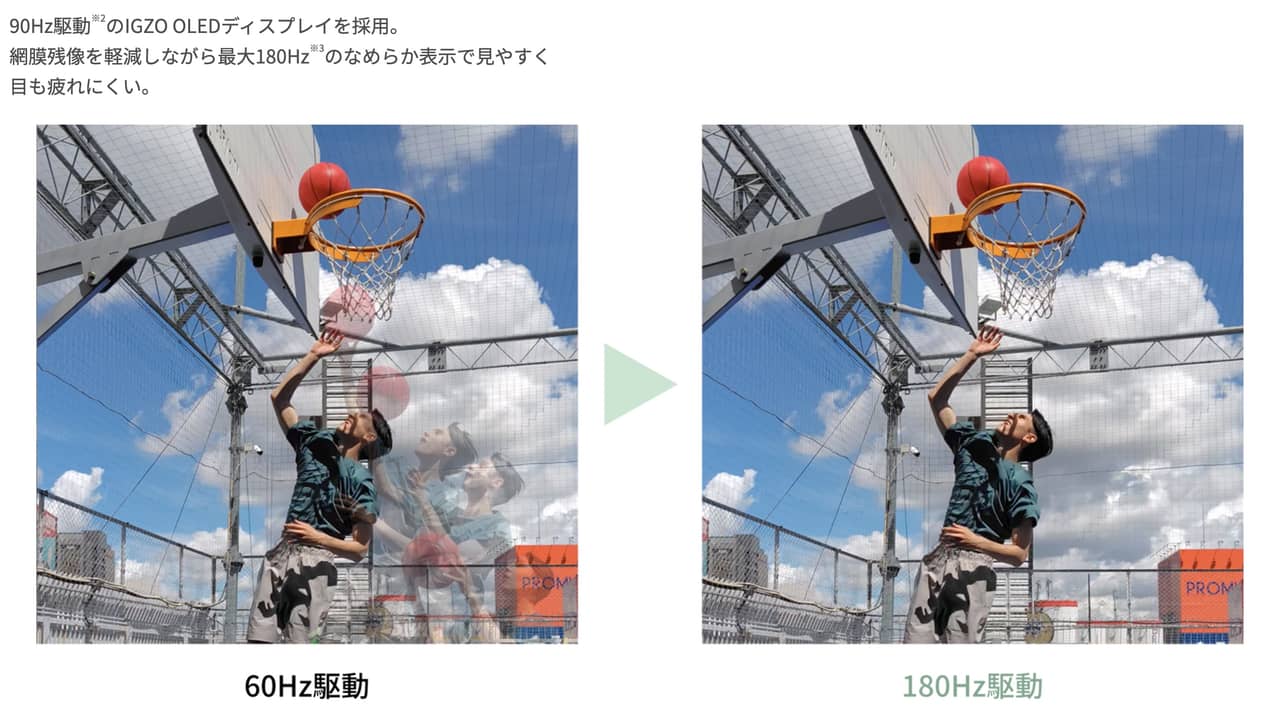 ▼で、AQUOS sense8はただ90Hzに対応するだけでなく、SHARPお得意の残像低減機能も搭載。。90Hzの表示の合間に黒画像を挿入することで残像を一気に軽減する最大180Hz表示にも対応してるんですよ。↓