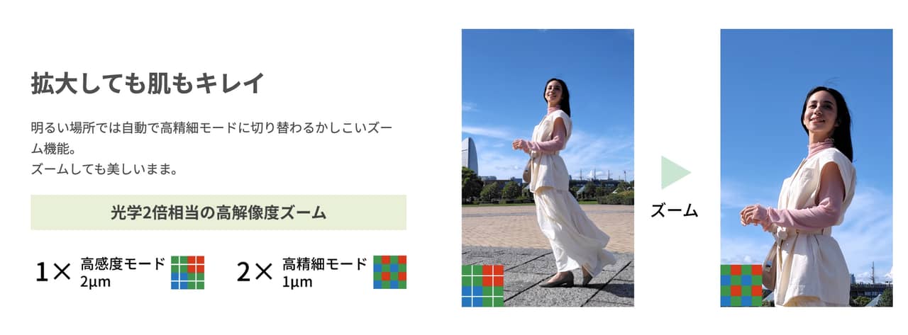 上記の説明では「明るい場所では」自動で高精細モードに切り替わるってことなので、光を多く取り込める時は高精細モードで光学2倍相当のズーム撮影、薄暗い場所だとデジタルズームになるんですかね?そういった気になる点は実機レビューで注目していきたいポイントですね!