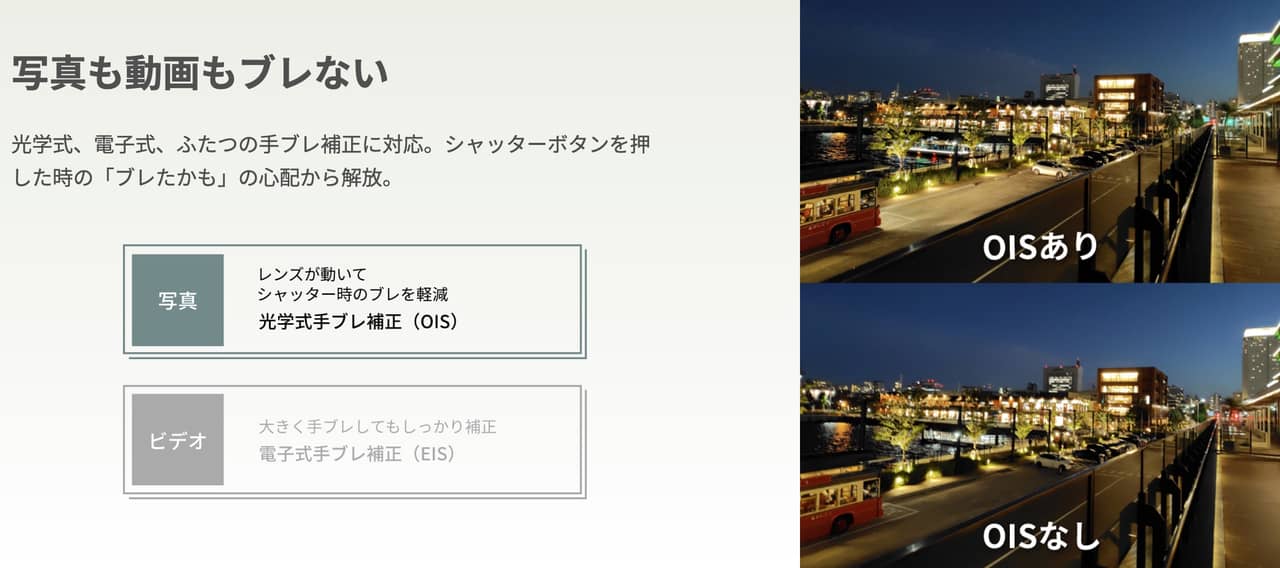 ▼前モデルのAQUOS sense7は電子手ぶれ補正のみ対応していましたが、遂にAQUOS sense8では光学手ブレ補正のOISに対応したんですよ!↓