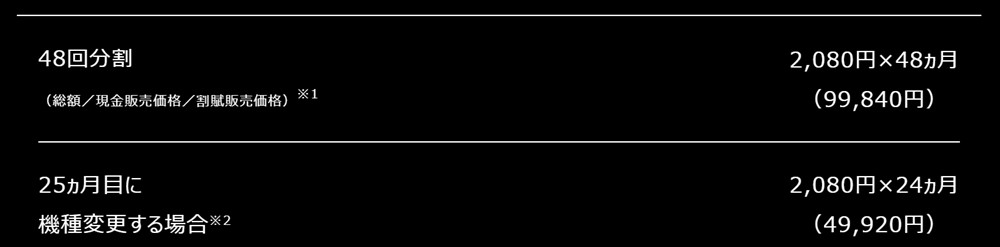 執筆時点での価格は99,840円となっているので、分割払いの審査が通りやすい価格帯に収まっています。一括と分割で価格差はなく、一括払いは99,840円、24回分割は月々4,160円、48回払いは月々2,080円。