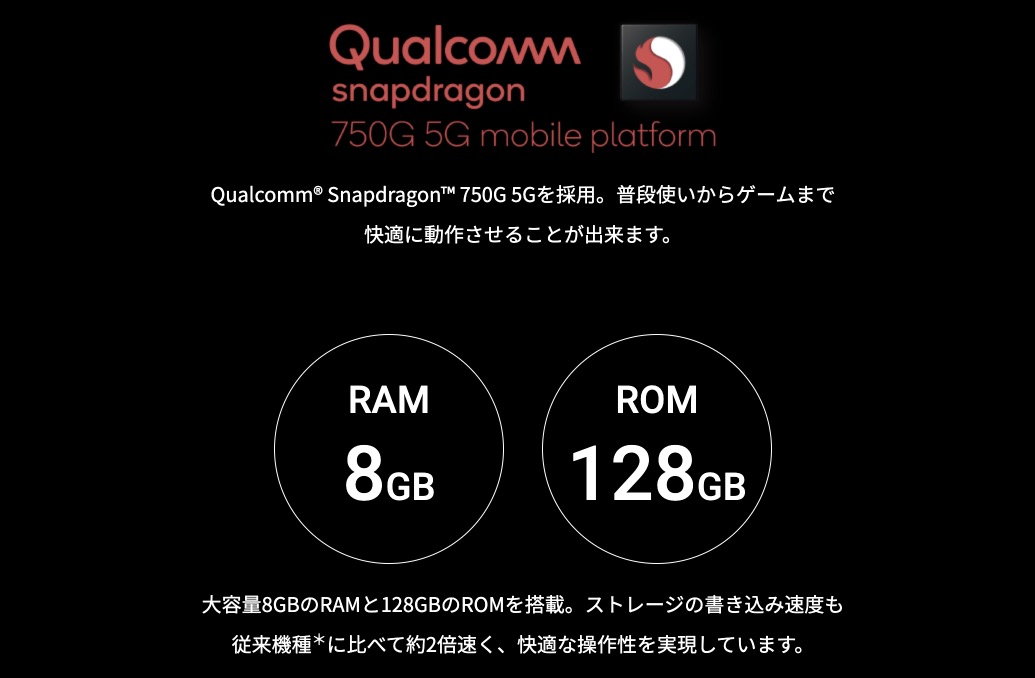 ▼SoCはSnapdragon 750G!AnTuTuでは総合約39万点、GPU性能9.5万点とミドルレンジの中でも高めの性能!メモリは8GB、ストレージは128GBです!↓