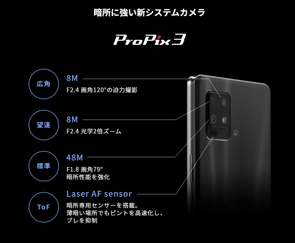 ▼ToFを使うレーザーオートフォーカスに対応することで薄暗いシーンでもピントが合わせやすくなってます。また、AQUOSカメラ画質技術のノウハウを詰め込んだ新エンジンProPix3を採用、画質にも期待が高まります。↓