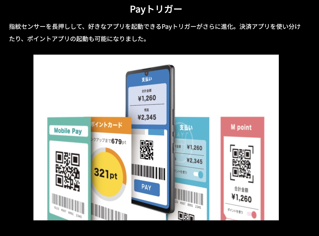 ▼この指紋センサーはPayトリガーに対応。指紋センサーを長押しすることえ決済アプリを起動できるほか、決済アプリの使い分け、ポイントアプリの起動も可能となり進化。AQUOSの便利機能も健在です。↓