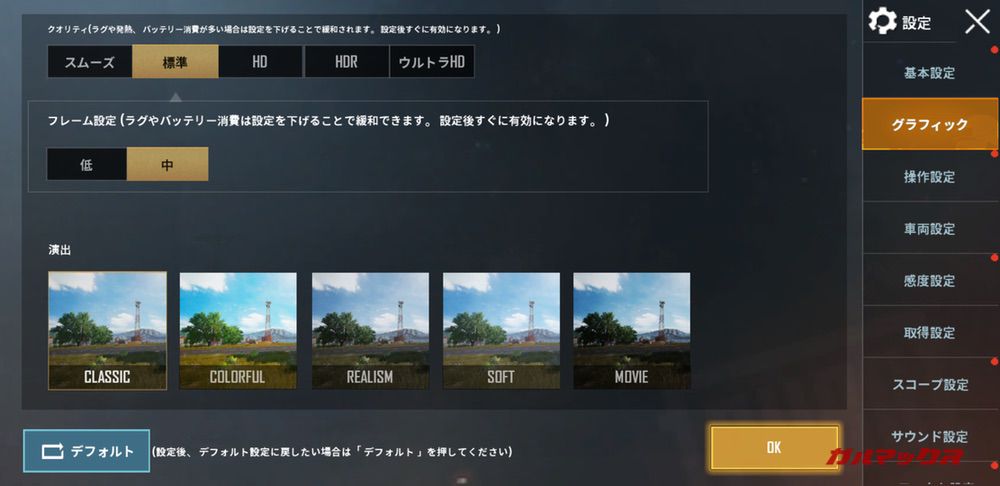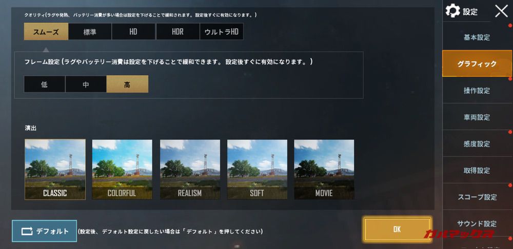 PUBGモバイルではクオリティを「標準」まで設定できました。その時のフレーム設定は「中」が最高となります。クオリティを「スムーズ」に設定した時のフレーム設定は「高」まで可能でした。
