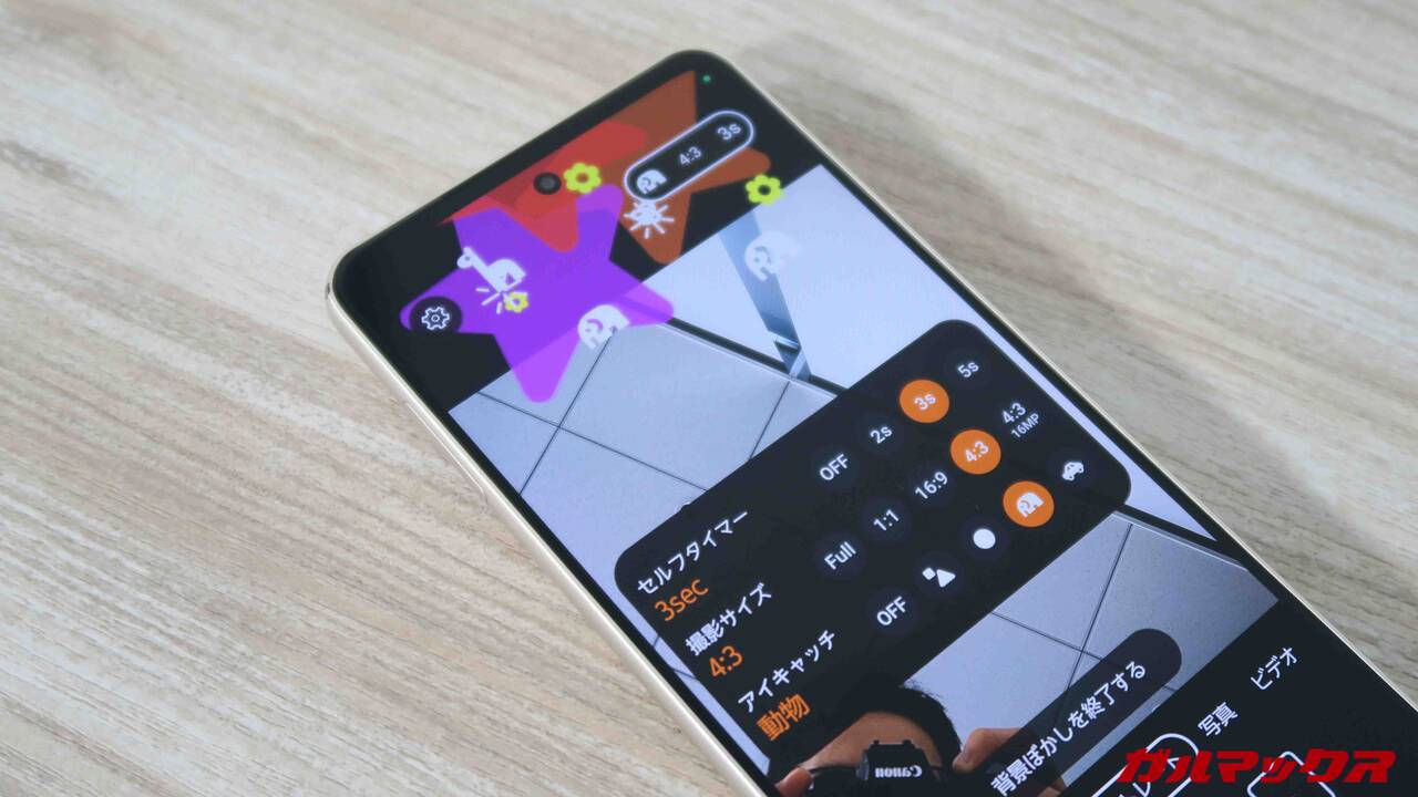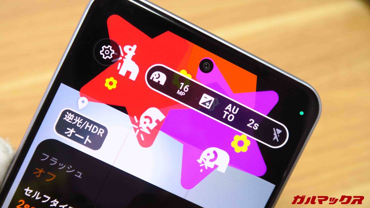 ▼あとインカメラ撮影時はカメラ周りに特殊なエフェクトが表示されます。これ、お子さんと自撮りするときにインカメラに視線を向けるための機能で、この目の付け所はシャープだわ(シャープじゃないけど)。↓