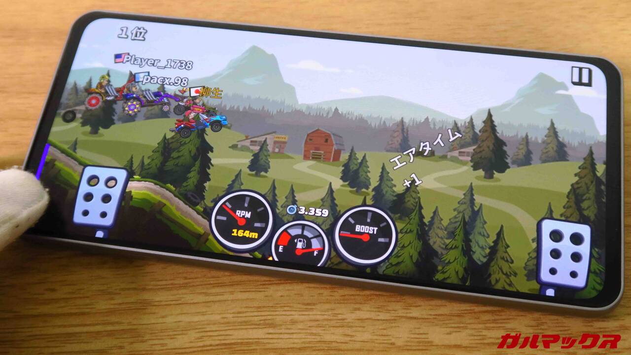 ▼しかし2Dゲームなら快適!筆者が大好きな物理横スクロールレーシングゲーム「Hill Climb Racing」ではサクサクです。パズル系とかシューティングとかそういうミニゲームなら不満はありません。↓