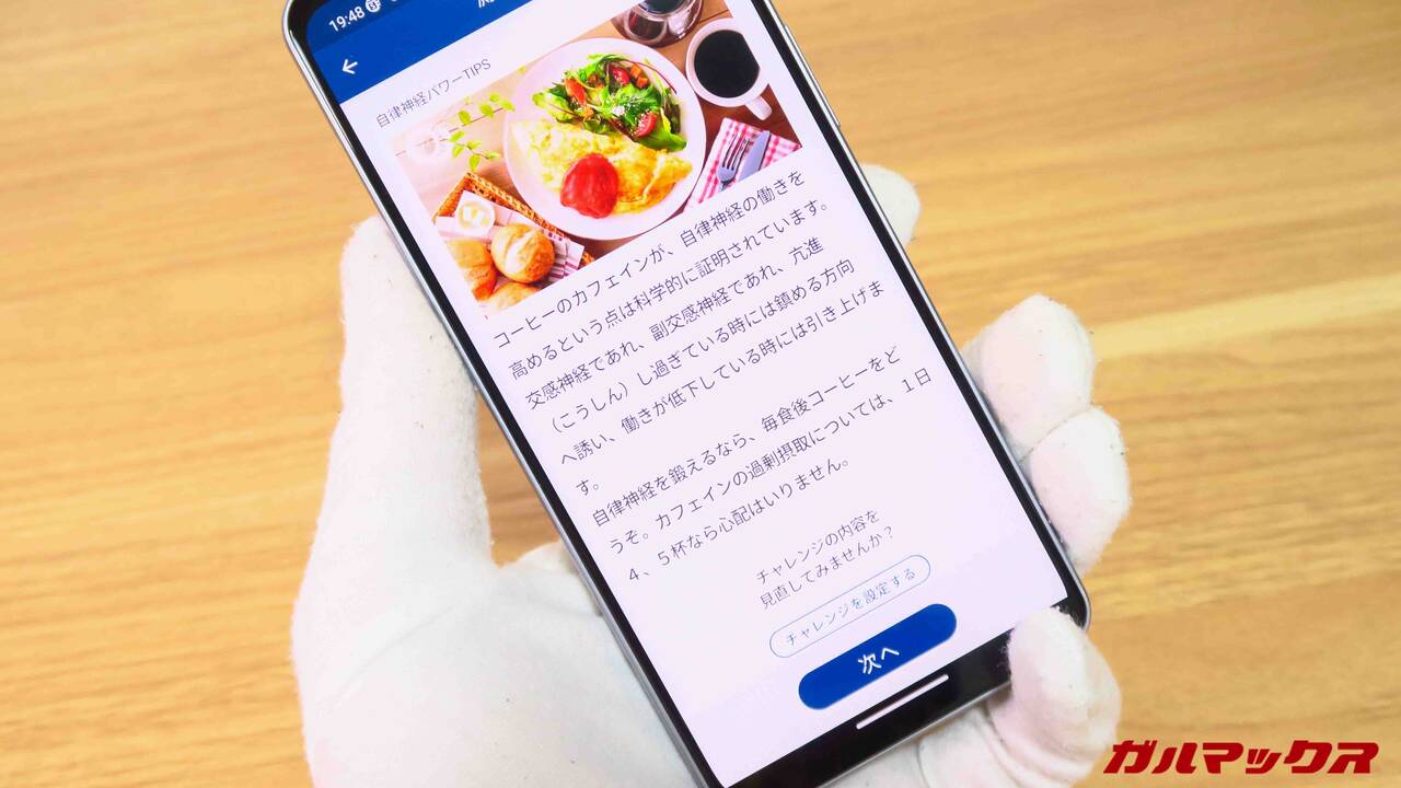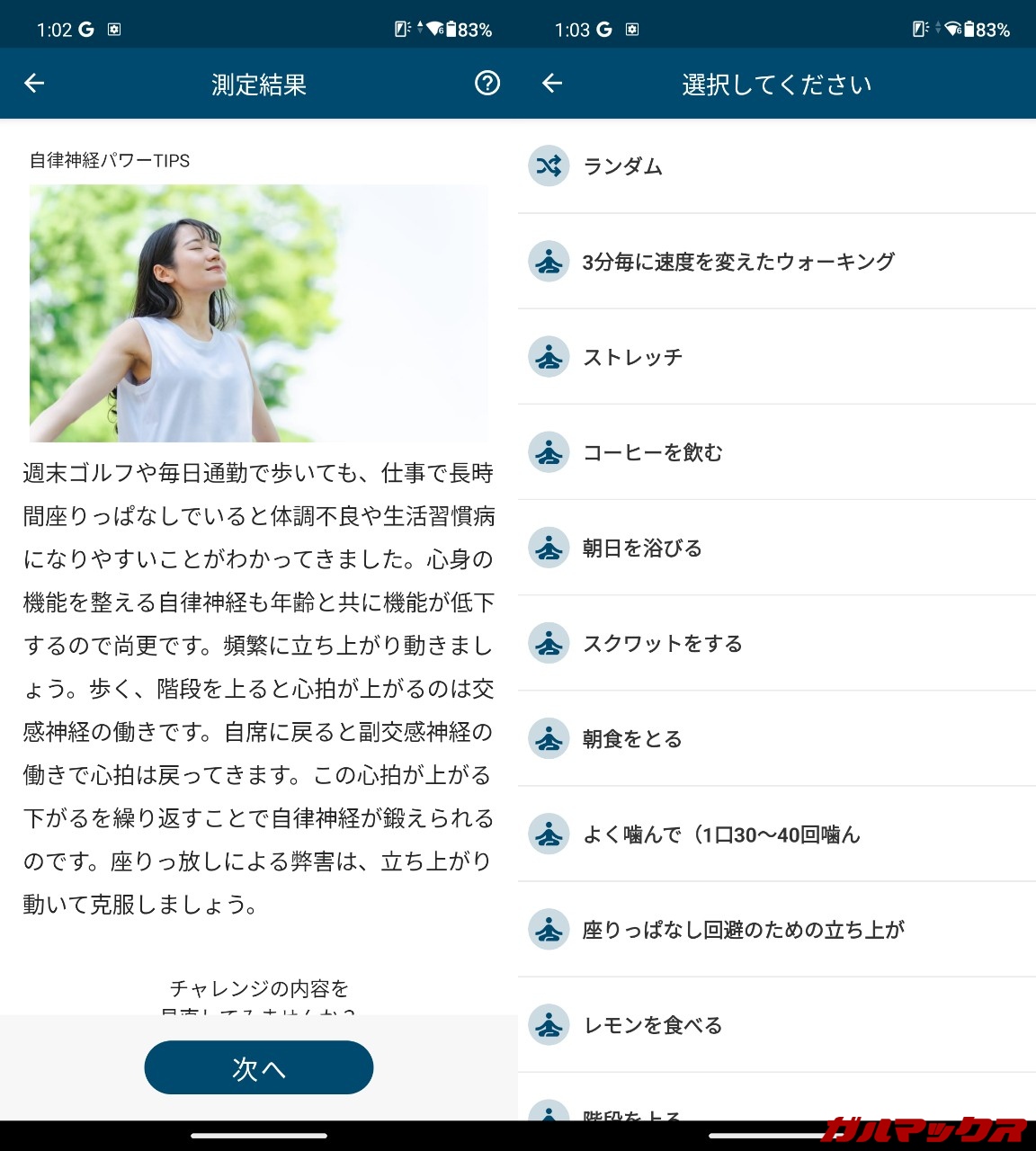 また自律神経の状態を改善するためのアドバイスもあり、元気になるための運動とか食生活を学ぶこともできるので結構これは流行ってほしい機能。不摂生な生活してるとマジで病むし。