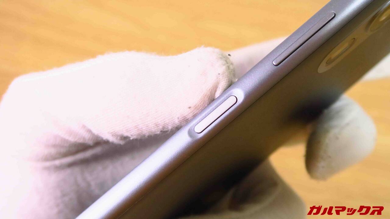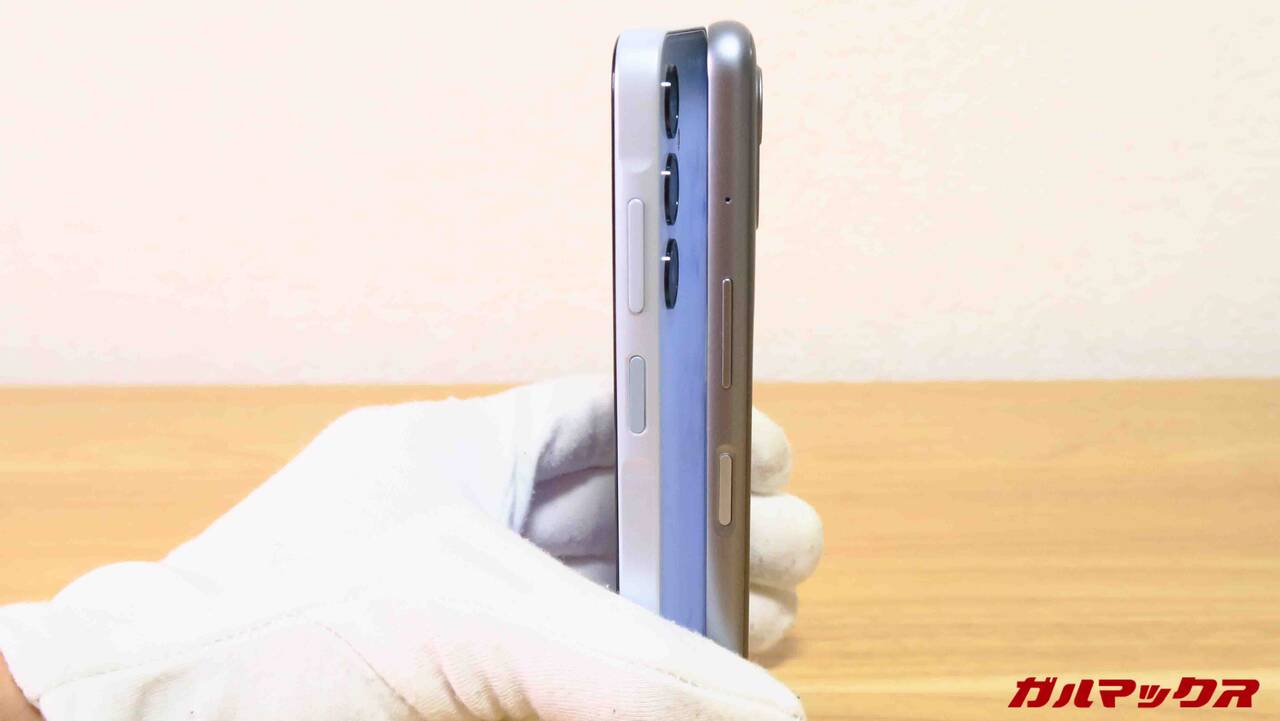 ▼サイドボタン類の位置も低めにとられており、片手でも操作しやすく手が小さい人でも操作しやすいのもGoodです。左は最近趣味で購入したGalaxy A25くん。ボタンの高さは全然違うよネ。↓
