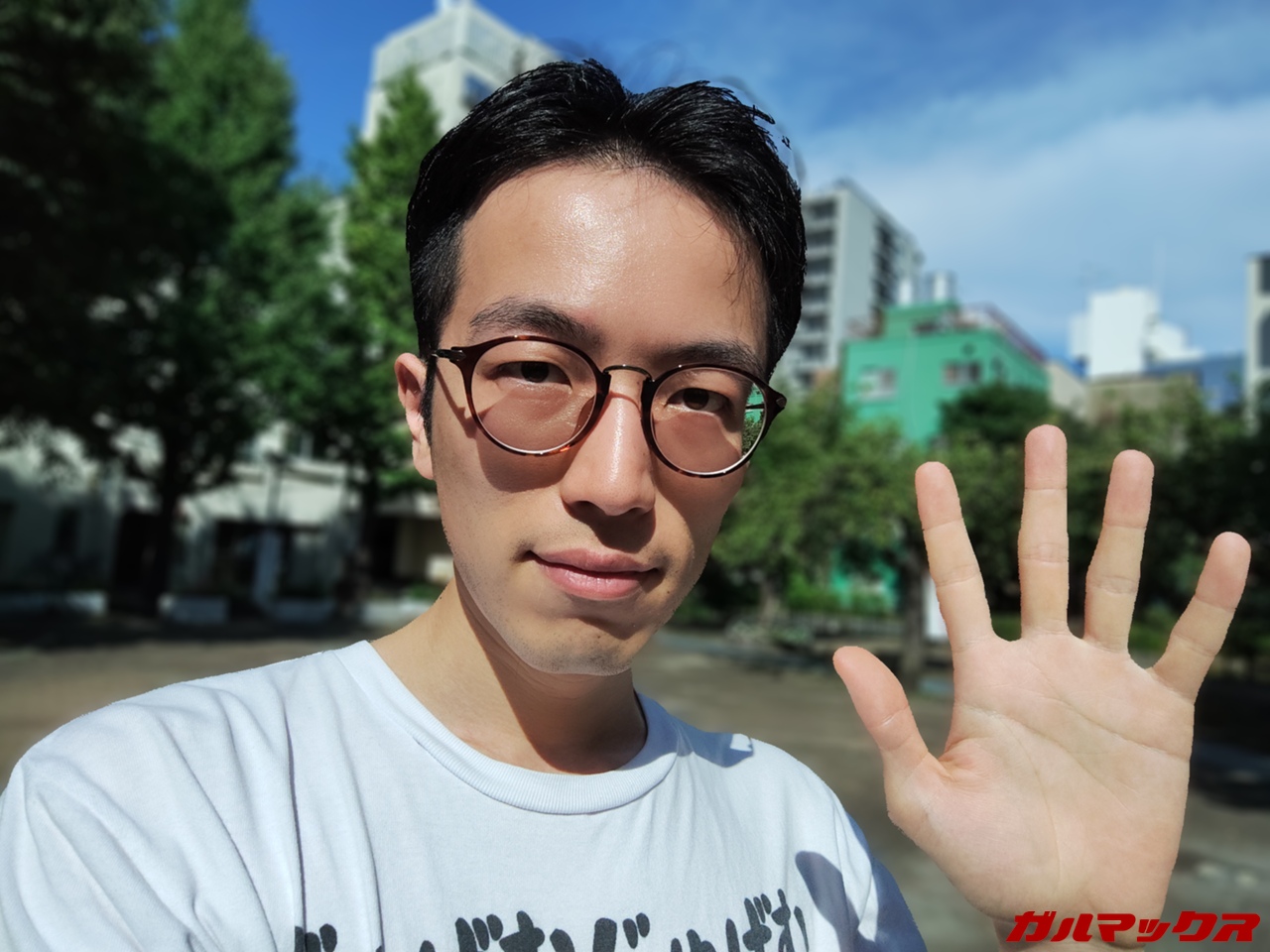 ▼自撮りはこんな感じでした。ポートレート(背景ぼかし)も対応しており、切り抜き精度自体もバッチリ良好!※遮光メガネなのですげぇ人相悪く見えますが仕様です。↓