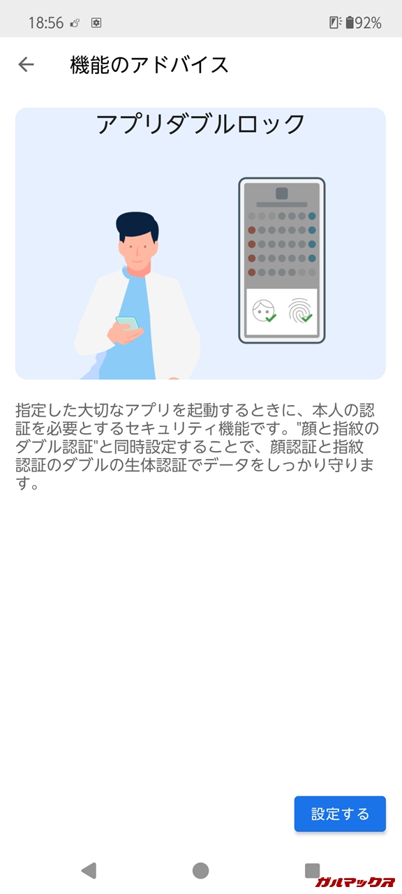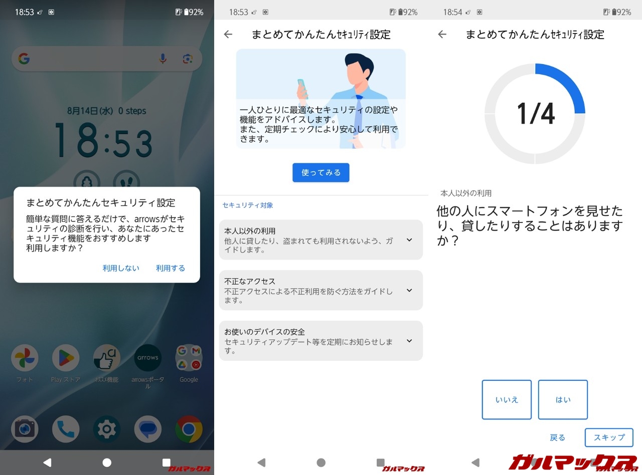 ▼初心者向けのセキュリティ設定も搭載。いくつかの質問に答えるだけで最適な設定方法を提案してくれるという、ここも国産スマホらしい要素ですね。↓